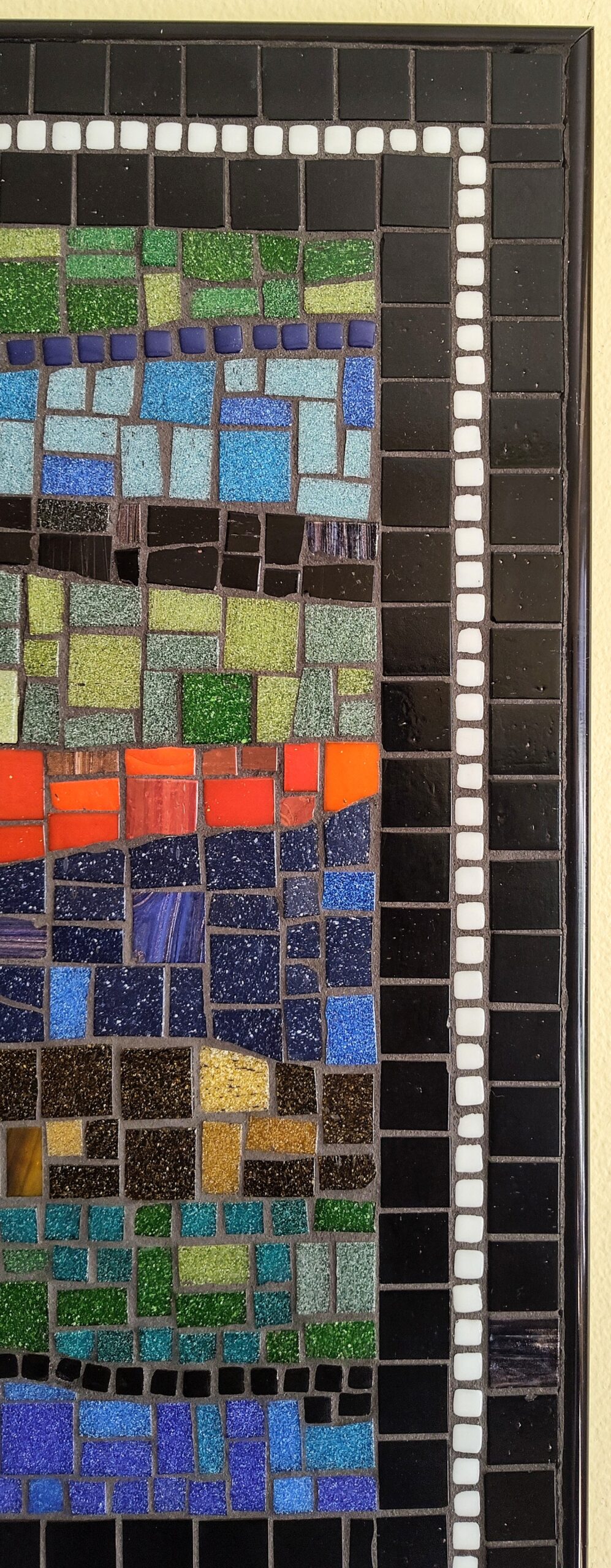 Multi color mosaic wall hanging, featuring a black and white border design in glazed and porcelain ceramic tiles.