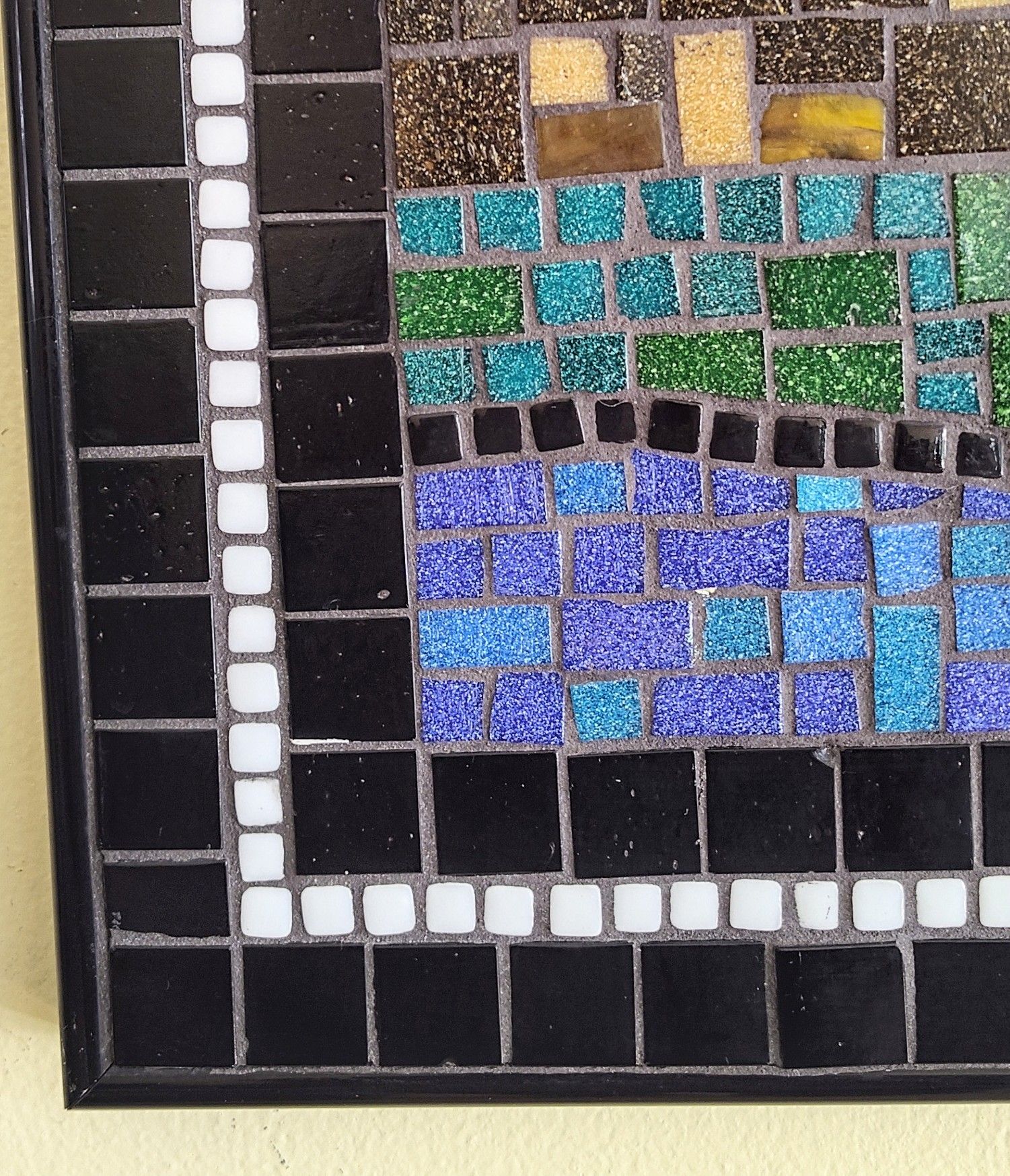 This piece is framed in black metal, with charcoal grout used to make the colors stand out